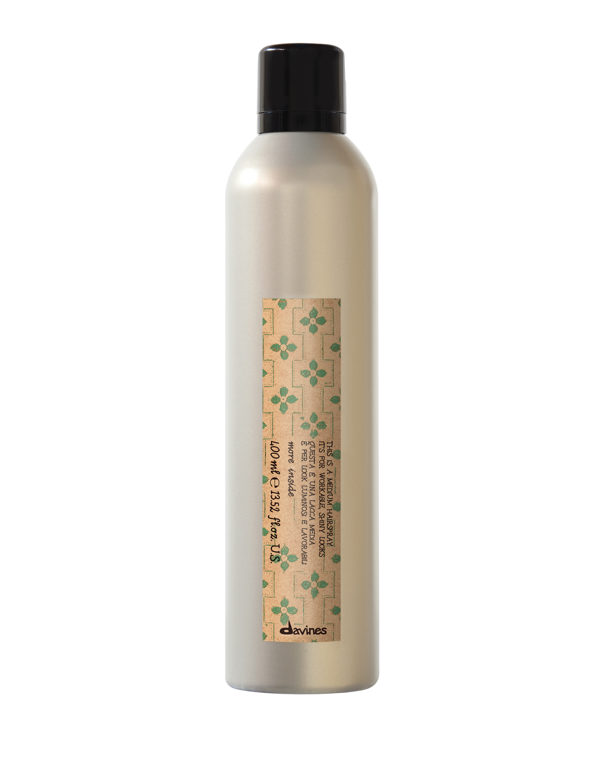 This Medium Hairspray eliminates frizz, adds structure and provides hold without leaving residue. It is easy to work with and brush out.