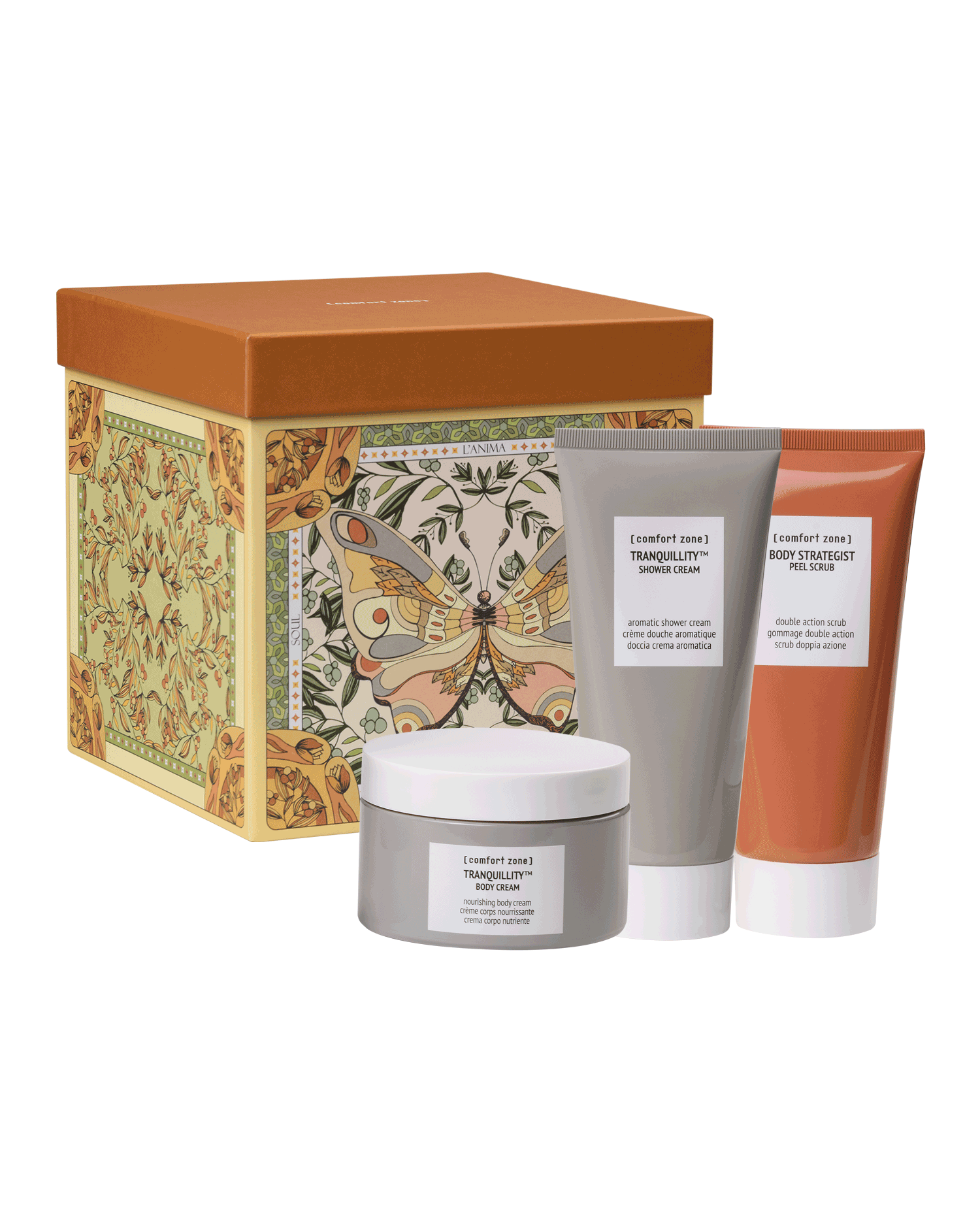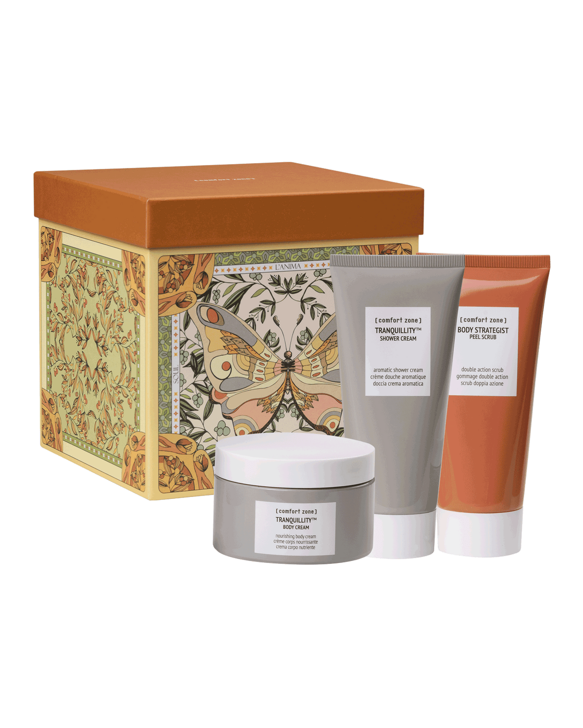 It contains Body Strategist Peel Scrub 200ml, Tranquillity Shower Cream 200ml and Tranquillity Body Cream 180ml. All products contain vegan formulas with a high percentage of naturally derived ingredients.