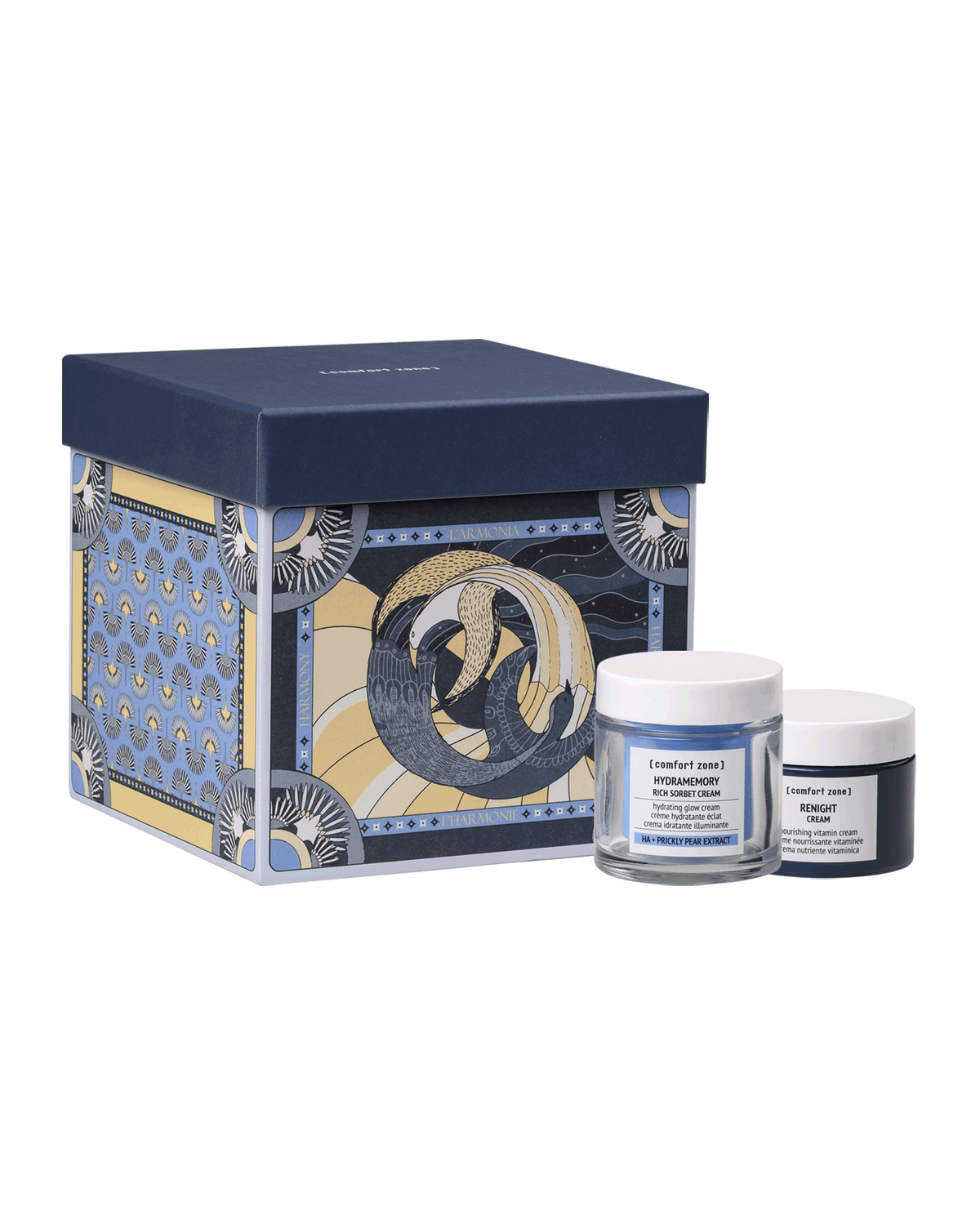The design, inspired by the language of tarot cards, celebrates harmony through the interaction between two opposing energies that generate balance in continuous succession.  It contains Hydramemory Rich Sorbet Cream 50ml and Renight Cream 60ml, both vegan formulas with a high percentage of naturally derived ingredients.