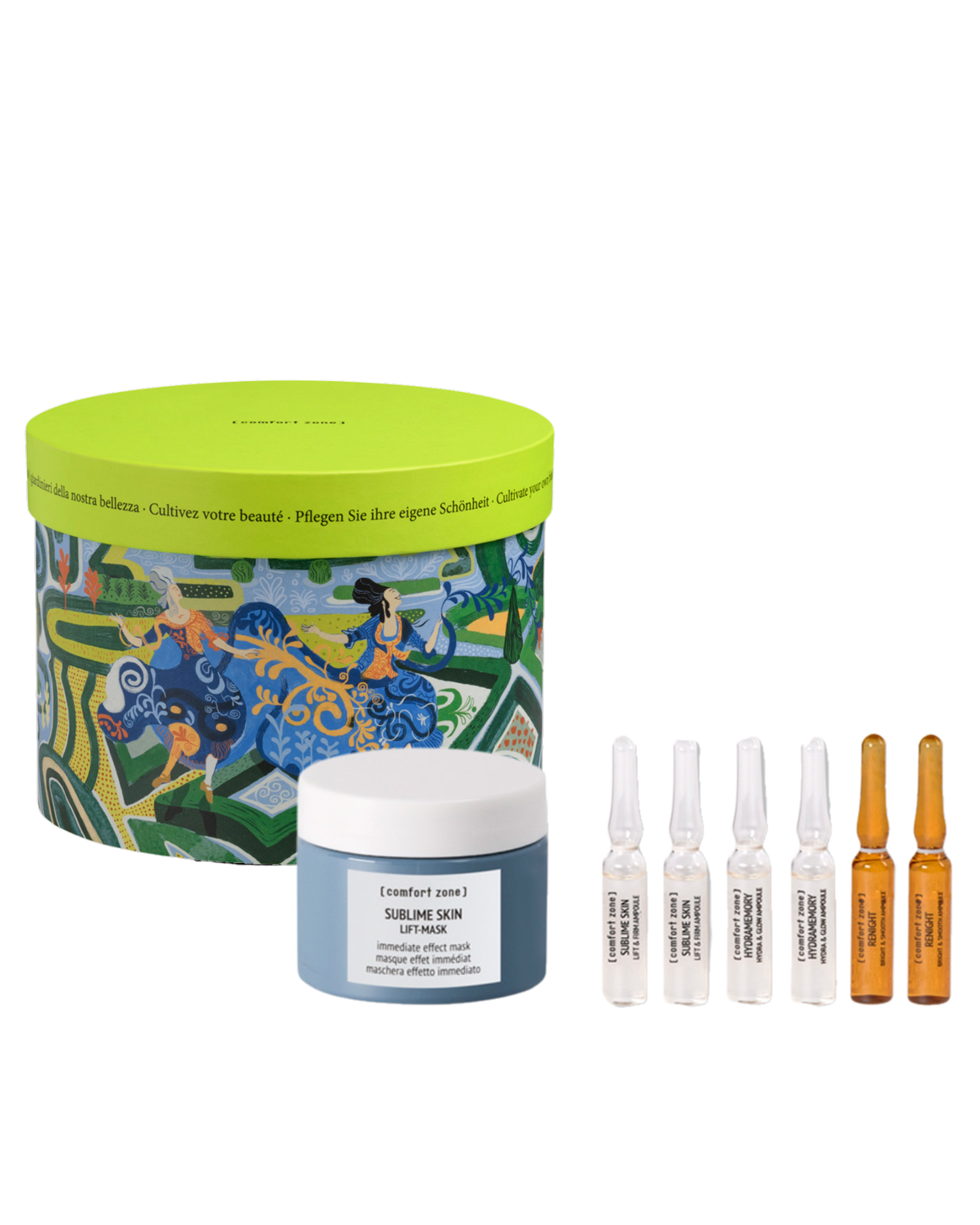 Discover the limited-edition FRENCH GARDEN Gift Box. Inspired by luxury and magnificence, this unique set contains a complete spa-worthy routine. The set includes Sublime Skin Lift-Mask (60ml), Renight Bright & Smooth Ampoules (2x2ml), Hydramemory Hydra & Glow Ampoules (2x2ml), and Sublime Skin Lift & Firm Ampoule (2x2ml). This routine is perfect for all skin types in need of hydration, and firming action.