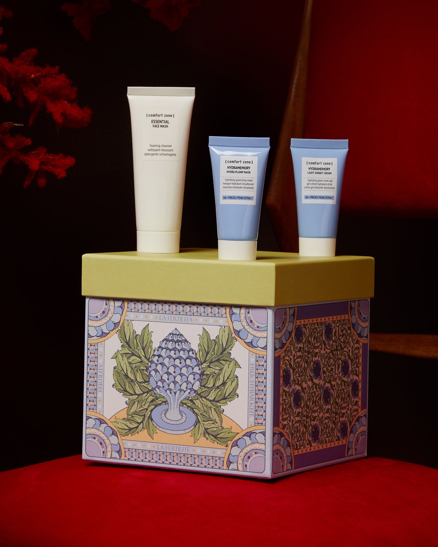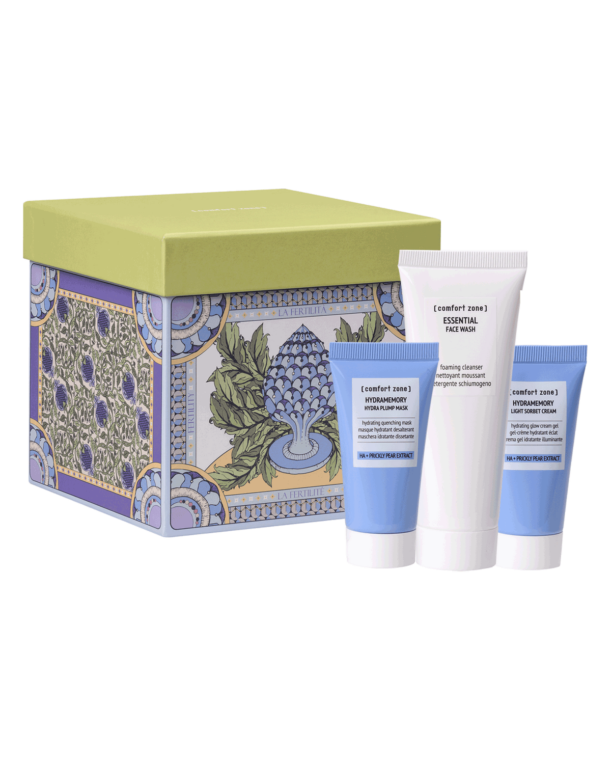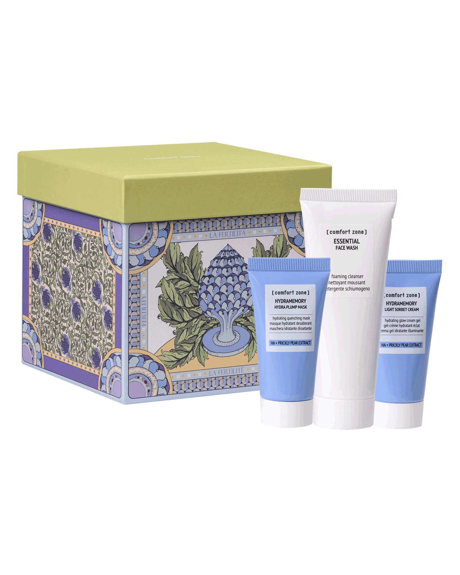 Contains Essential Face Wash 75ml, Hydramemory Hydra Plump Mask 30ml and Hydramemory Light Sorbet Cream 30ml, all vegan formulas with a high percentage of naturally derived ingredients.