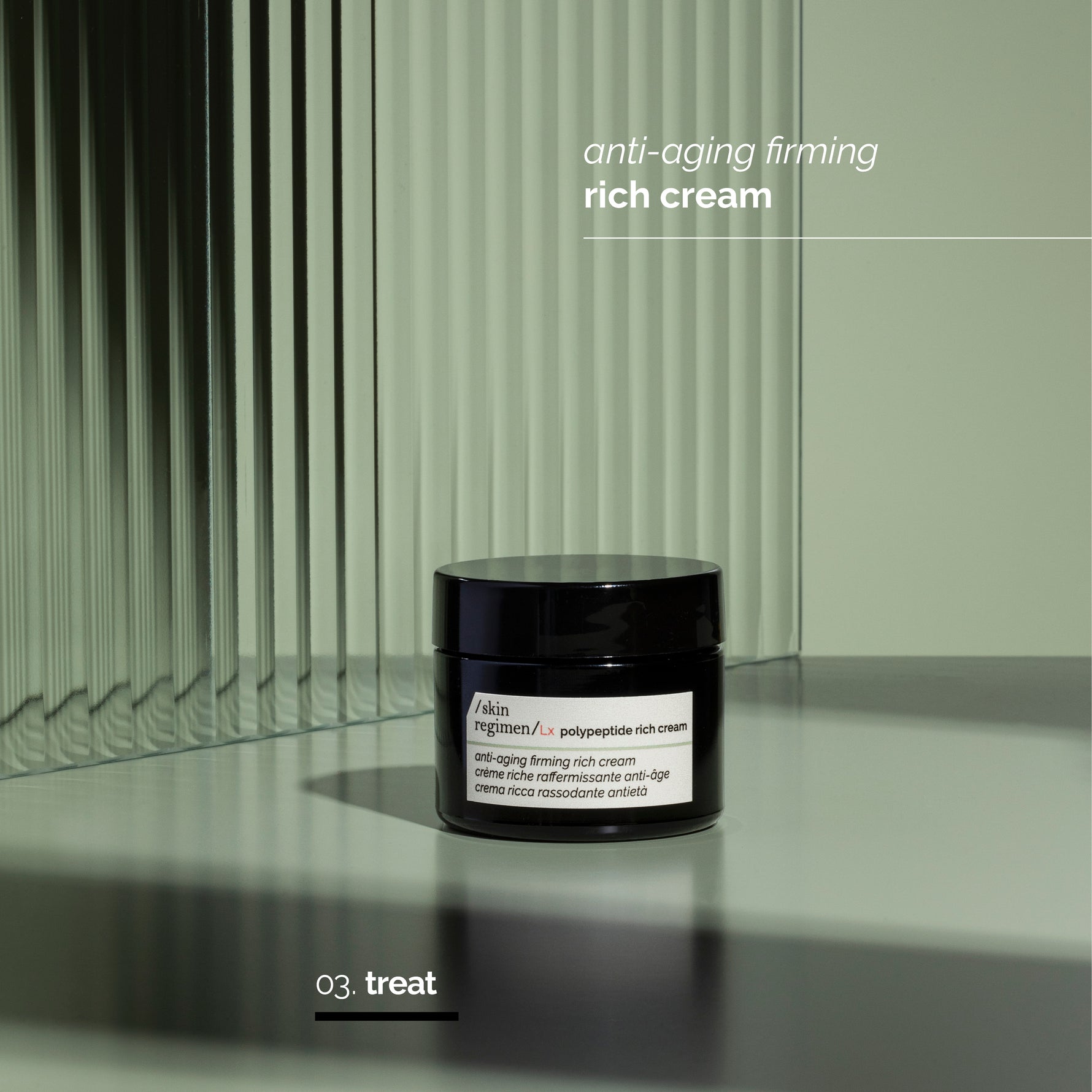 Discover /skin regimen/Lx Polypeptide Rich Cream, a rich, illuminating cream that helps correct the appearance of signs of aging. Enriched with Ectoin and Longevity Complex™ to support skin structure, it visibly reduces loss of tone and diminishes the appearance of surface wrinkles. The biomimetic texture, enhanced with shea butter, squalane, and glycerin, guards the enveloping blend of juniper, coriander, and jasmine essential oils, creating a fragrance that promotes well-being.