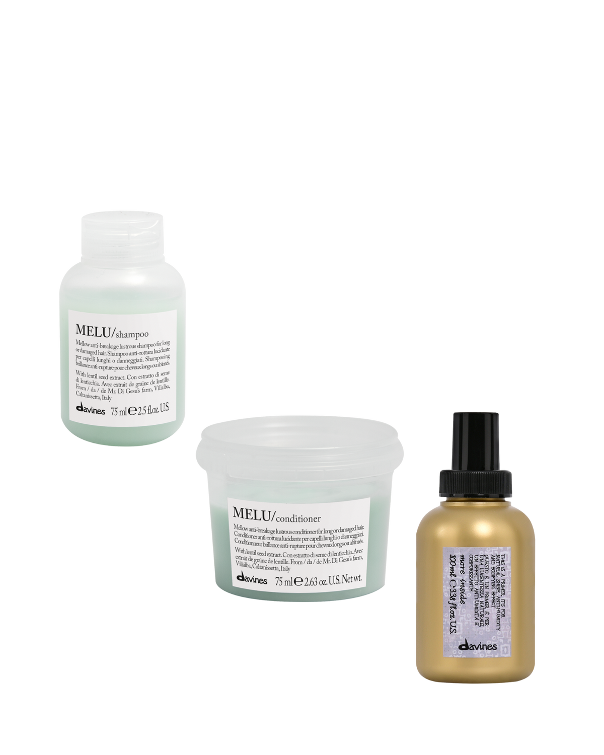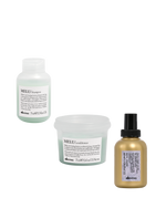 The kit includes MELU Shampoo and Conditioner and a creamy pre-fold spray primer that gives body to the hair and creates an anti-moisture barrier protects from heat facilitating natural styling.
