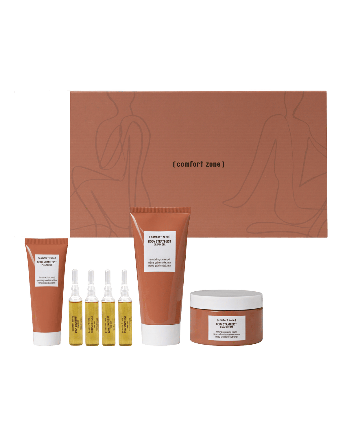 Exfoliate and prepare your skin with BODY STRATEGIST Peel Scrub 75ml, enhance and improve results with a concentrate of powerful toning ingredients in BODY STRATEGIST Tone Shot 4x10ml, reshape the look of your silhouette with BODY STRATEGIST Cream Gel 200ml and finally tone and nourish your skin with BODY STRATEGIST D-Age Cream 180ml. This month-long cosmetic treatment helps firm skin that is losing tone and promotes a more toned, firm and elastic appearance.