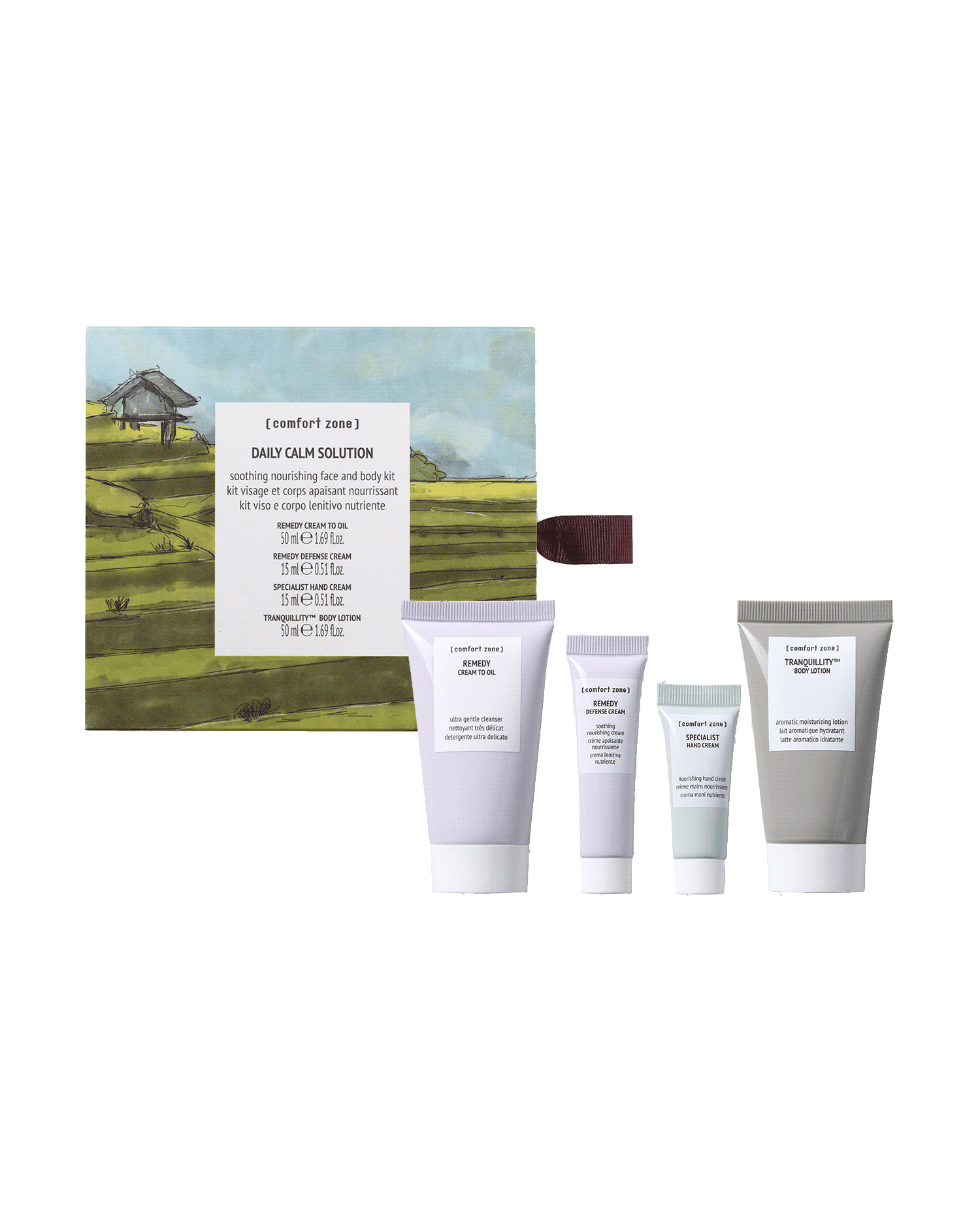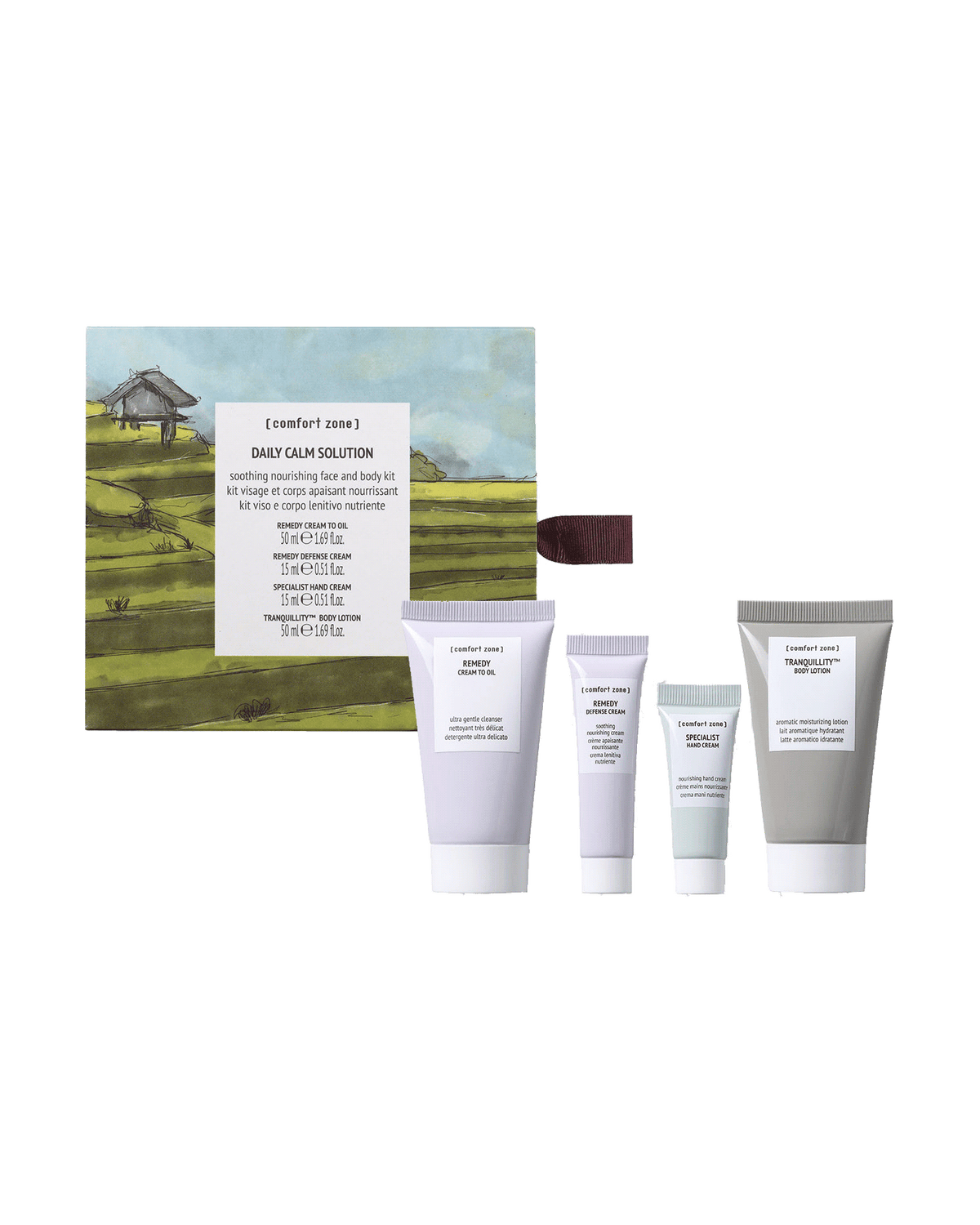 Discover the new daily calm solution, a kit that aims to provide relief, soothe and fortify skin. The products are enclosed by a hand illustrated case featuring a beautiful landscape of our planet and the convenient mini sizes are ideal for travel, trying out a new skin care routine or having them on hand at all times. Cleanse your face with the gentle Remedy Cream to Oil (50ml), nourish and protect against redness with the soothing Remedy Defense Cream (15ml). Comfort your hands by applying the rich, fast absorbing specialist hand cream (15ml) and finally indulge in the wonderful aroma of Tranquillity with the moisturising body lotion (50ml). These vegan formulas contain a high percentage of naturally sourced ingredients. The packs are made with FSC paper and the packaging is 100% recyclable and C02 offset.