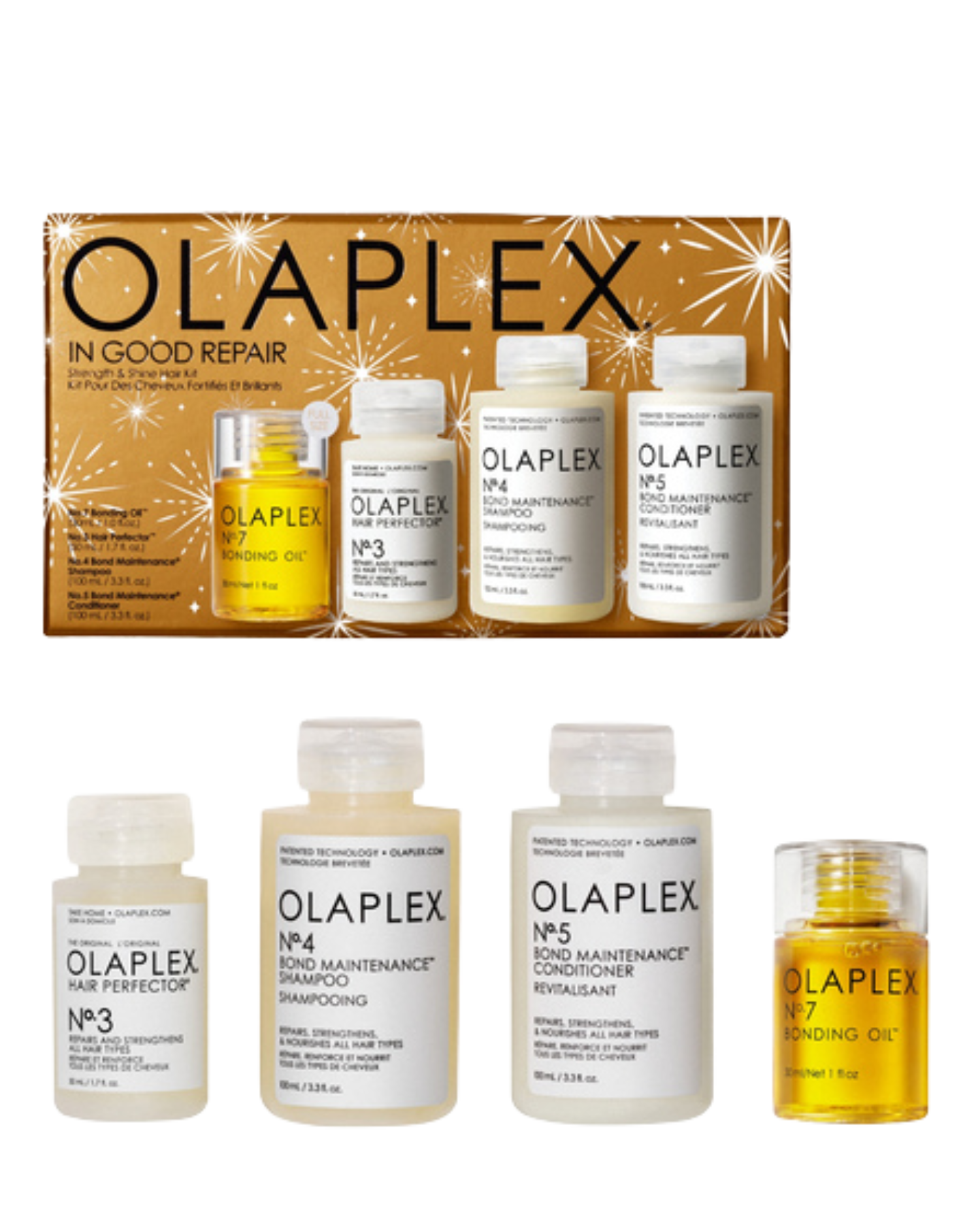 This perfectly giftable routine of four OLAPLEX® top sellers will keep any hair type shining with health. Includes a full-sized, shine-boosting OLAPLEX Nº.7 and a starter-sized Nº.3, the iconic repair treatment powered by the complete bond builder for immediately stronger, visibly healthier hair.
