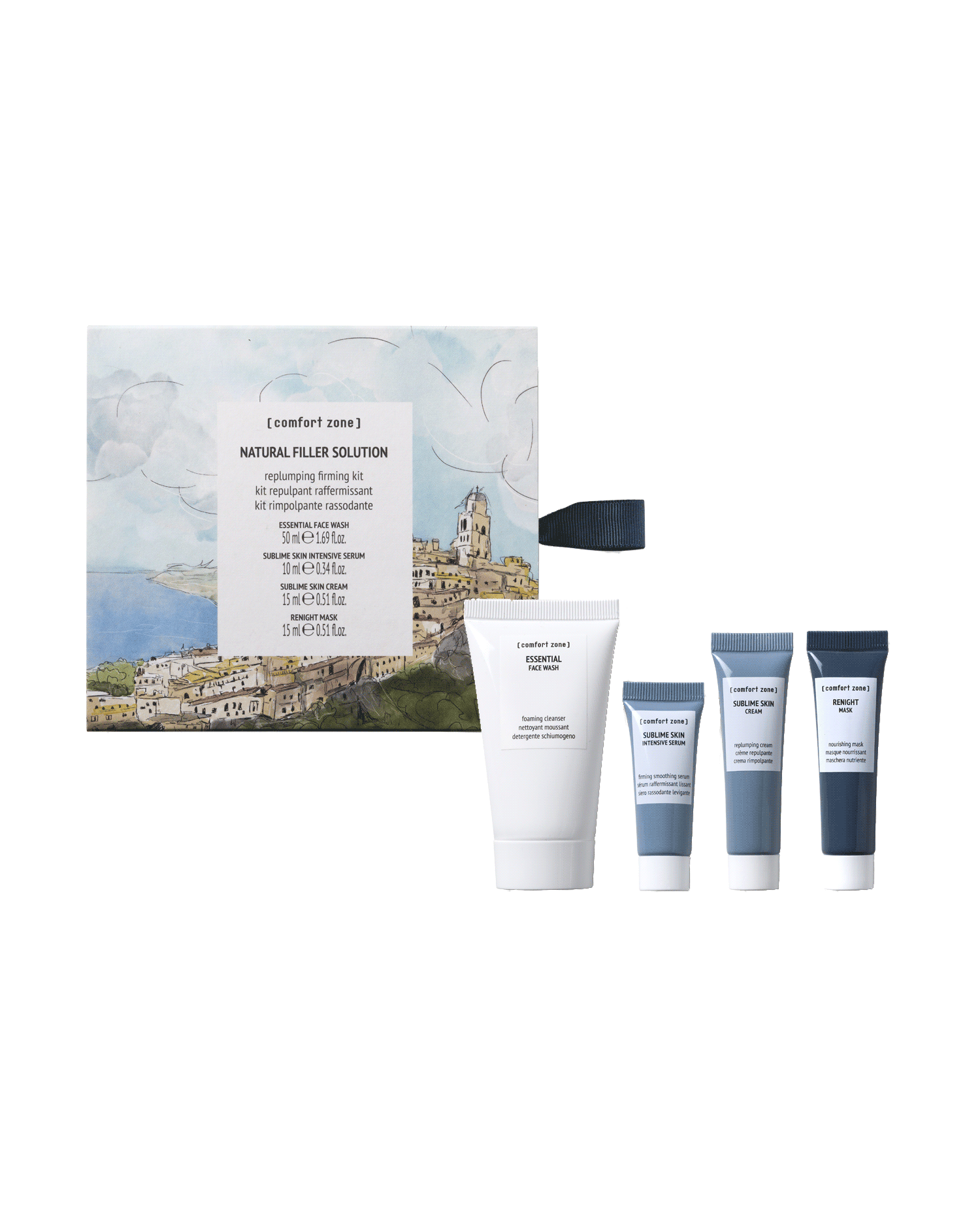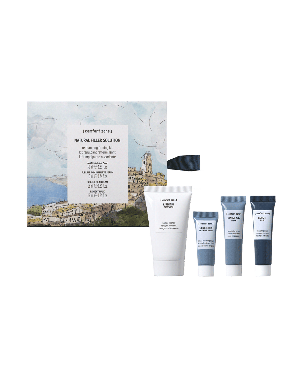 Enjoy a regenerative weekend without giving up on your skin care routine, the new natural filler solution kit offers a complete beauty routine. Inside the case enriched by a hand made illustration of one of our planets beautiful landscapes, you will find four comfort zone products in convenient mini formats. Ideal for a few relaxing days but also for consumers curious to try new facial products for a new routine. Cleanse your face and remove make up with Essential's Face Wash (50ml), plump and smooth your skin with Sublime Skin Intensive Serum (10ml) followed by Sublime Skin Cream (15ml) one of the most loved lines. Finally pamper and nourish your skin at night with Renight Mask (15ml). These vegan formulas contain a high percentage of naturally sourced ingredients. The packs are made with FSC paper and the packaging is 100% recyclable and C02 offset.