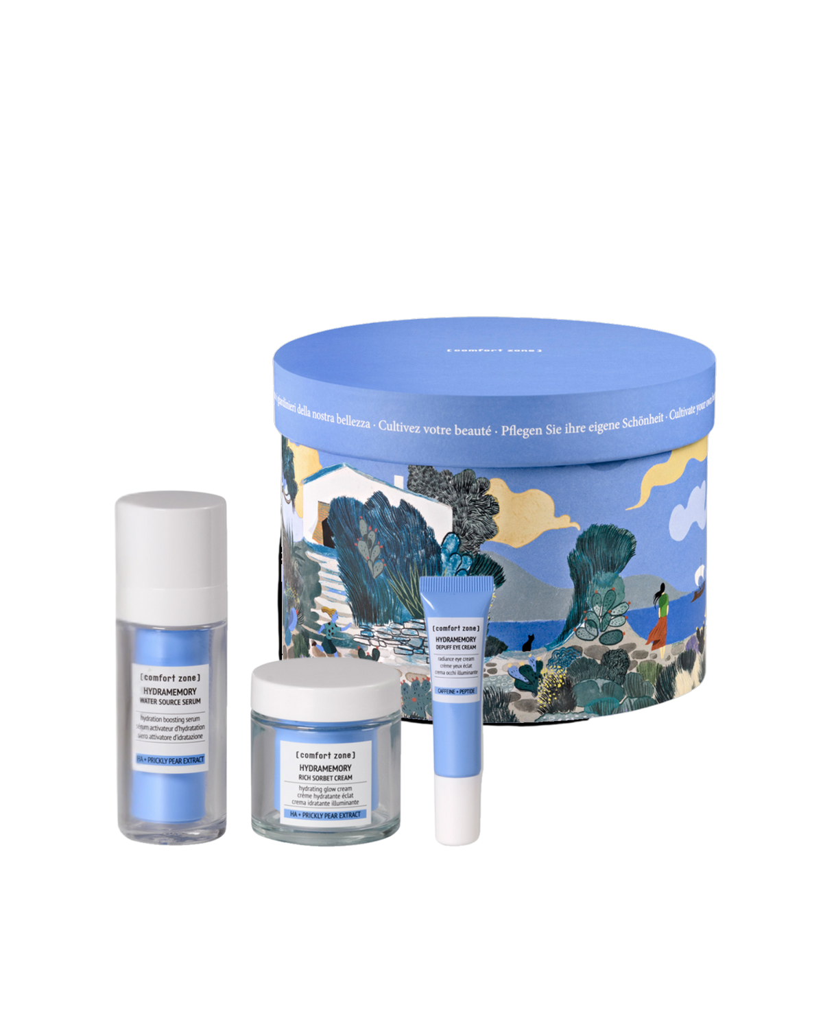 Supercharge your skin with a complete hydrating routine. Discover the limited-edition MEDITERRANEAN GARDEN Gift Box—perfect for bringing back glow and radiance to dry, dehydrated skin. The set contains our best-selling Hydramemory collection: Water Source Serum (30ml), Rich Sorbet Cream (60ml), and Depuff Eye Cream (15ml).
