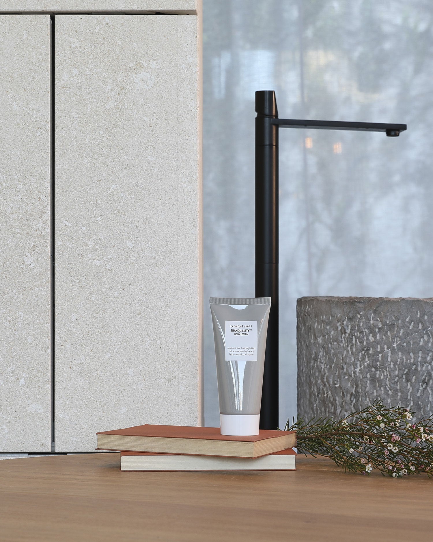 An aromatic, silky body emulsion with a light, hydrating texture.